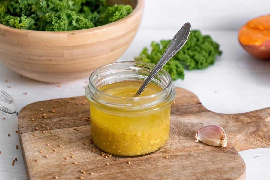 Using a tablespoon at a time, rub this salad dressing mixture into the kale leaves to gently massage them. This softens the leaves.