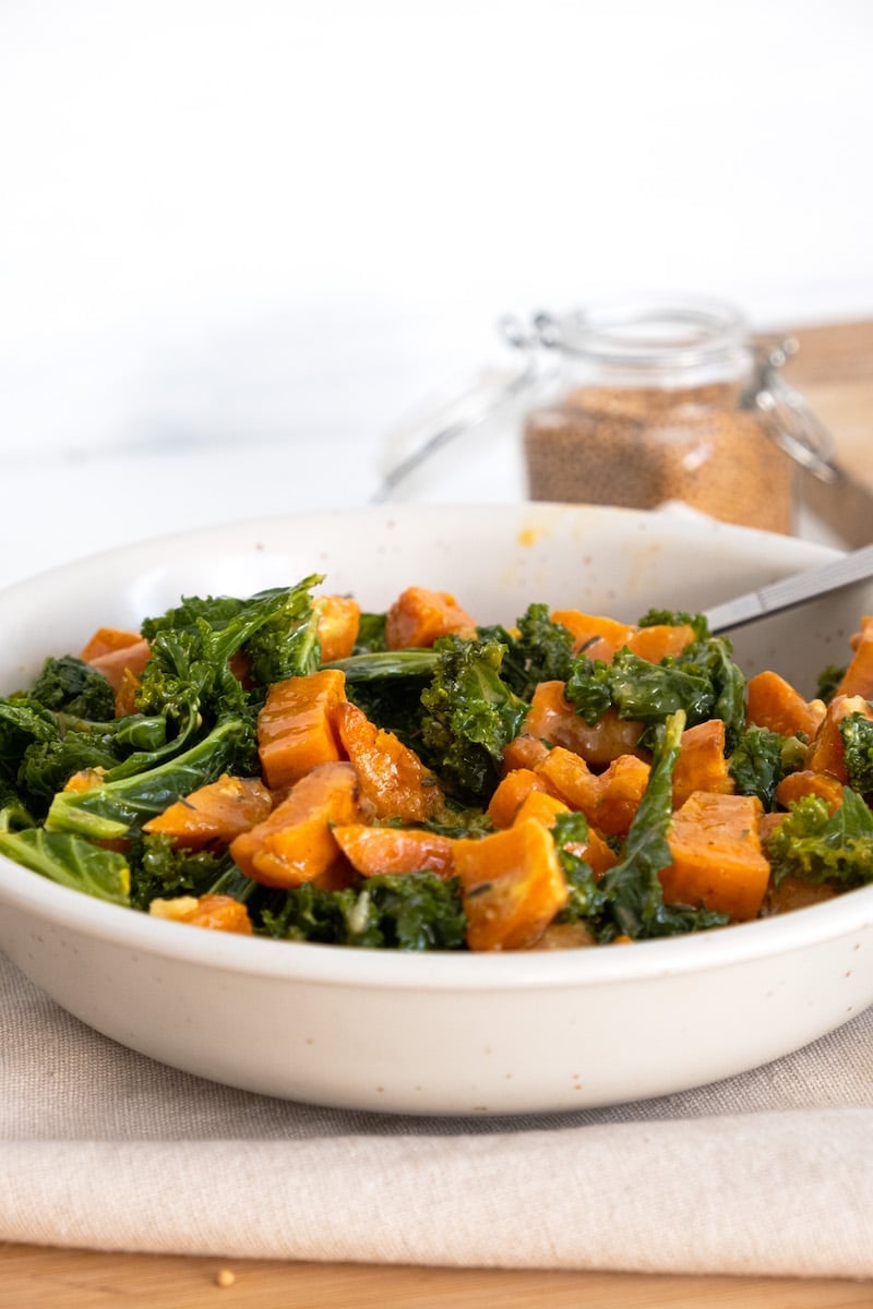 kale and sweet potato salad in white bowl