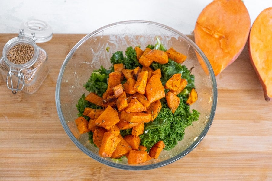 Combine the sweet potatoes with the massaged kale.